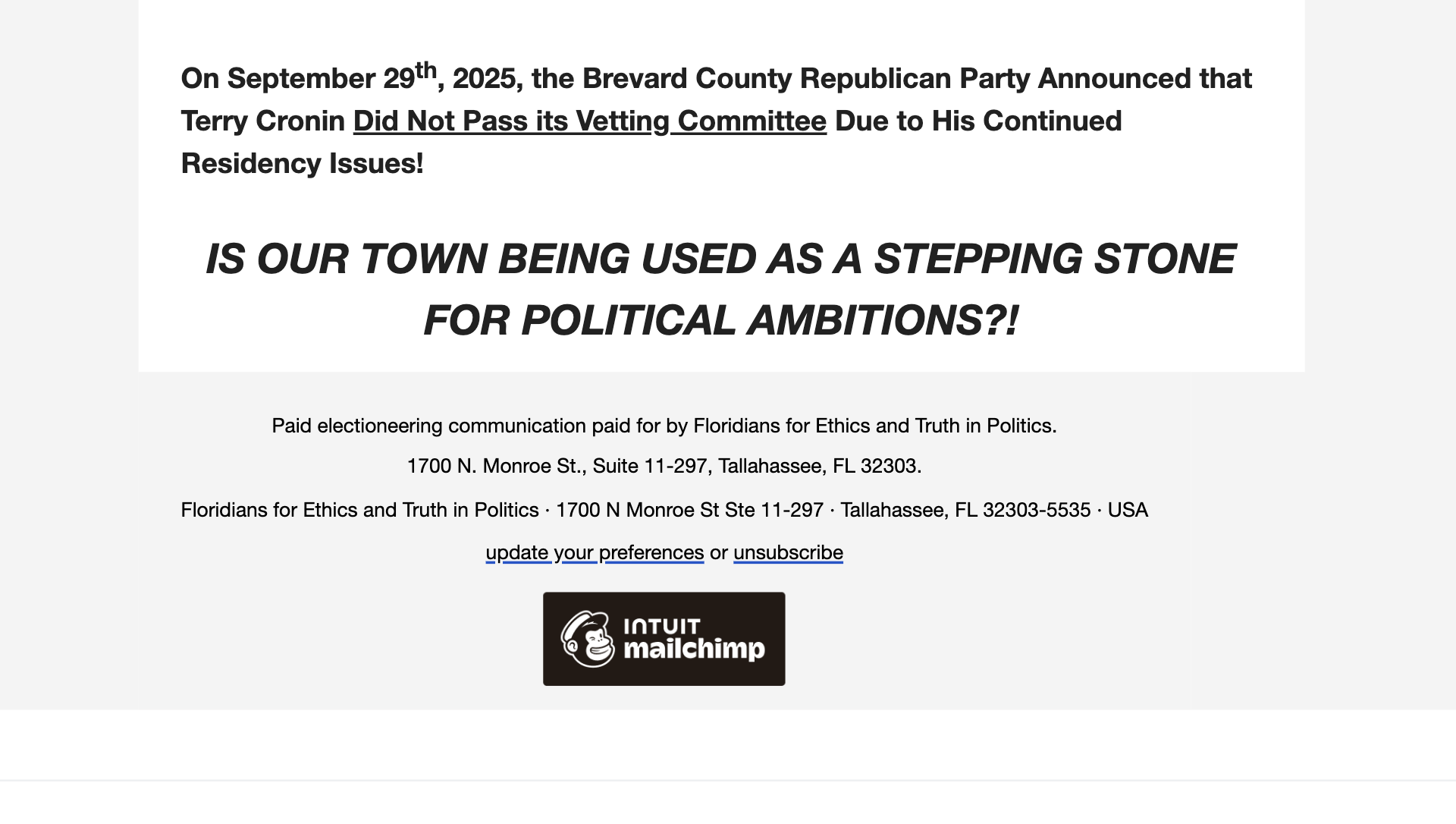 Floridians for Ethics and Truth in Politics PAC is who paid for the recent smear email against Terry Cronin. SEE BELOW