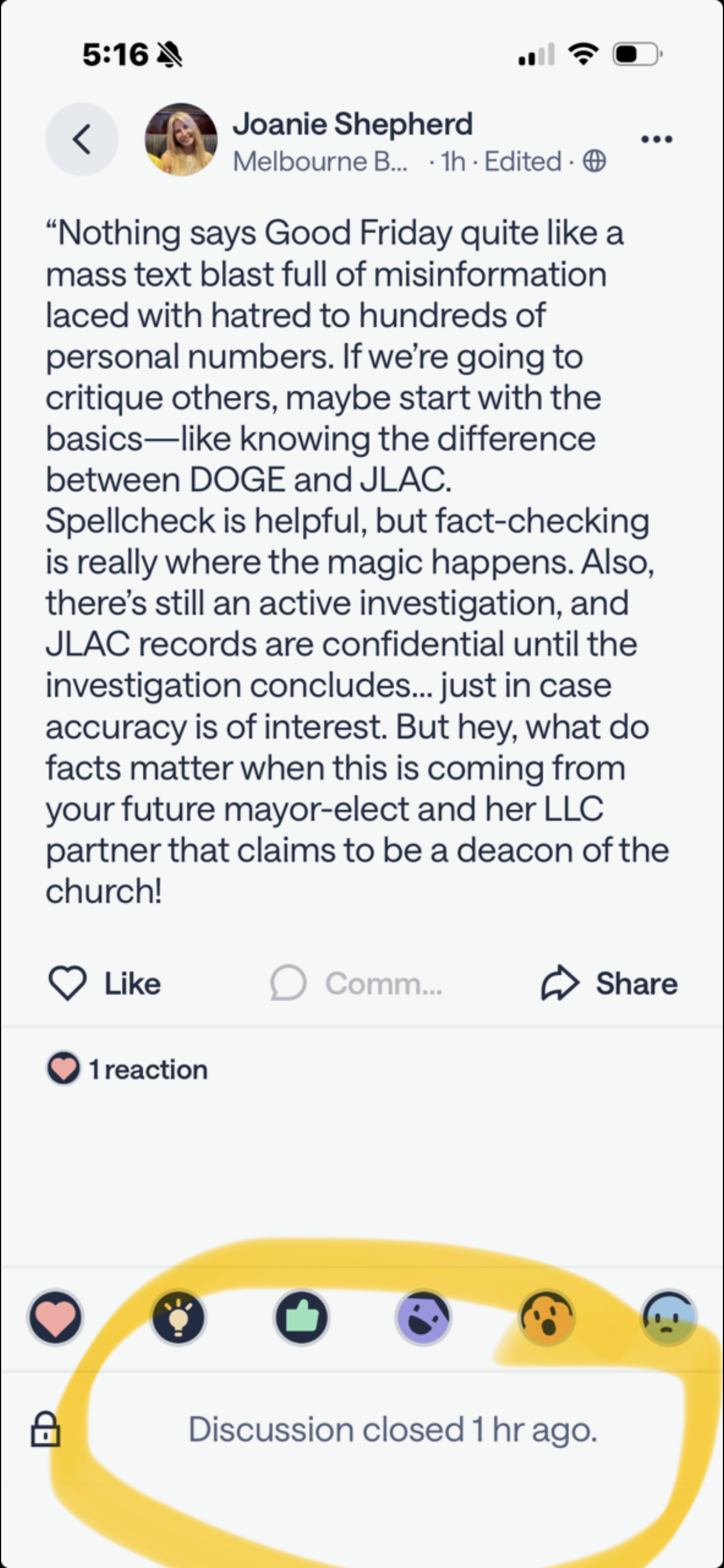 In Ms. Shepherd’s post she writes, “But hey, what do facts matter when this is coming from your future mayor-elect…” While her statement may not be libelous, she is misinformed about the “mayor-elect” and spreading gossip on Nextdoor. Spoiler Alert: Truth and Accuracy Matter is looking forward to announcing the mayoral candidate that we will be supporting in the upcoming November election. So please stay tuned!