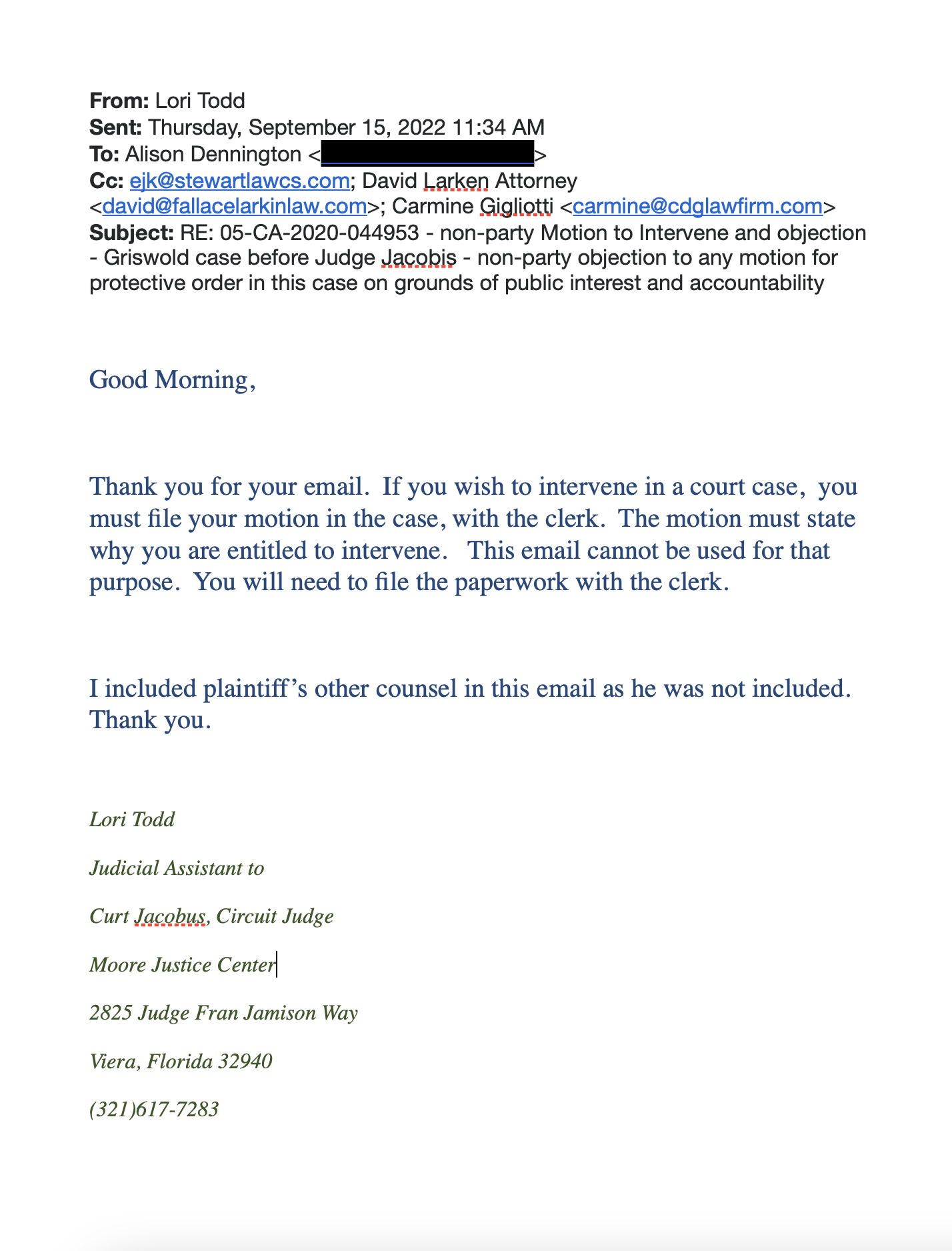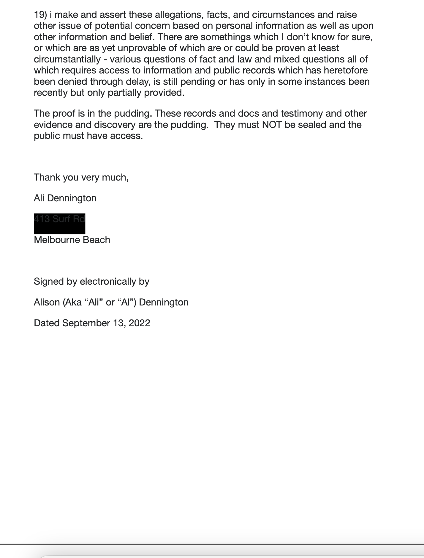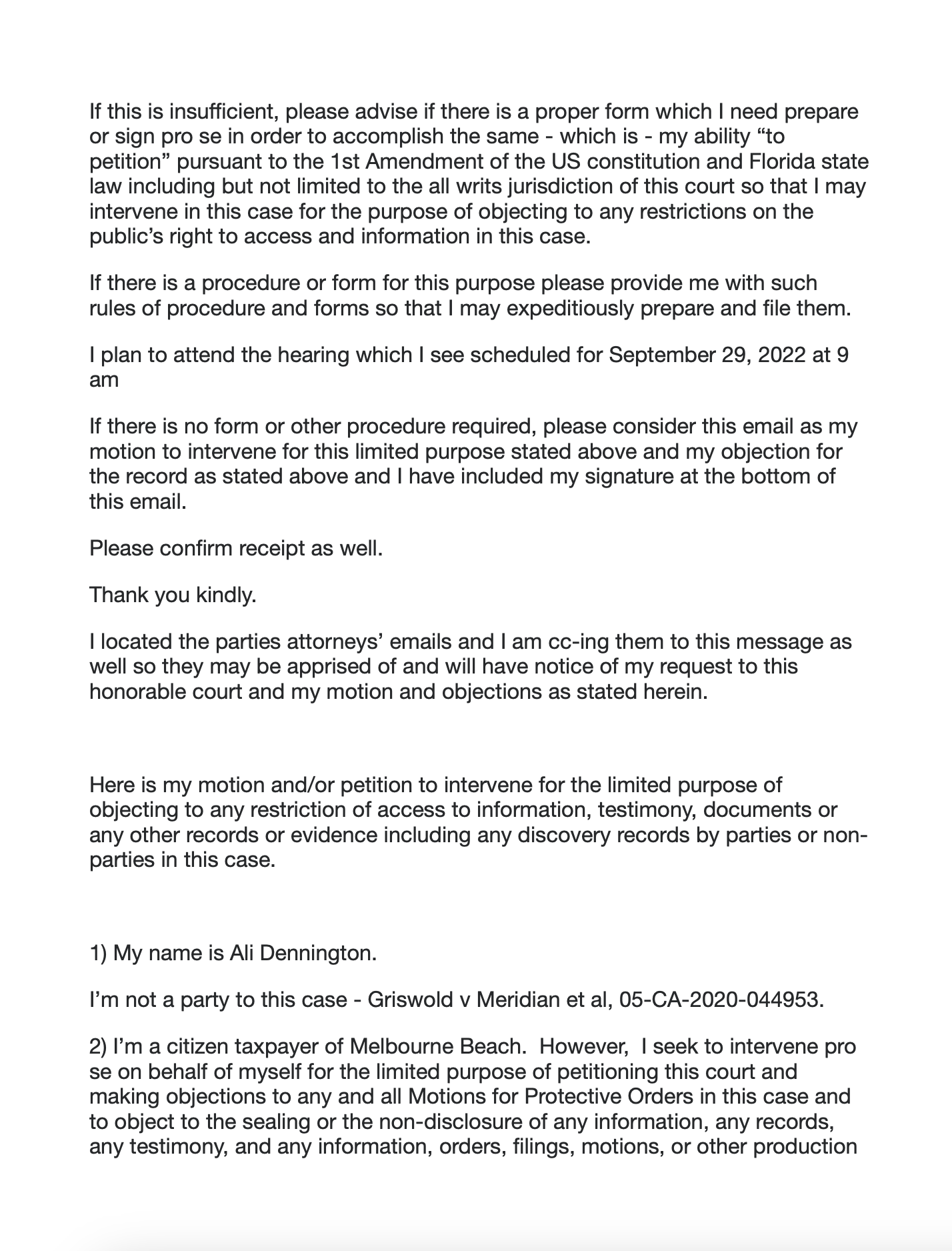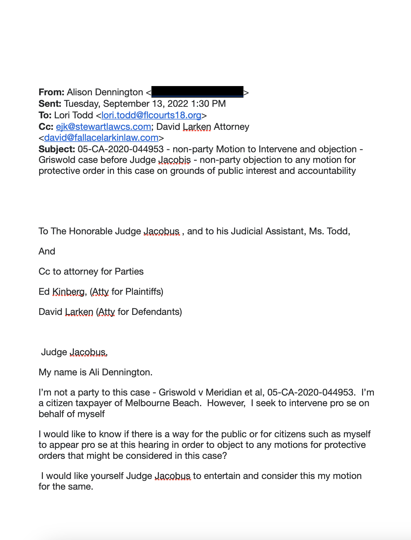 Ali Dennington wrote the following email to the office of Judge Jacobus. Get yourself a glass of wine and some popcorn to read this one! For someone who claims to be an attorney, or had been an attorney, she should know how to present a motion!